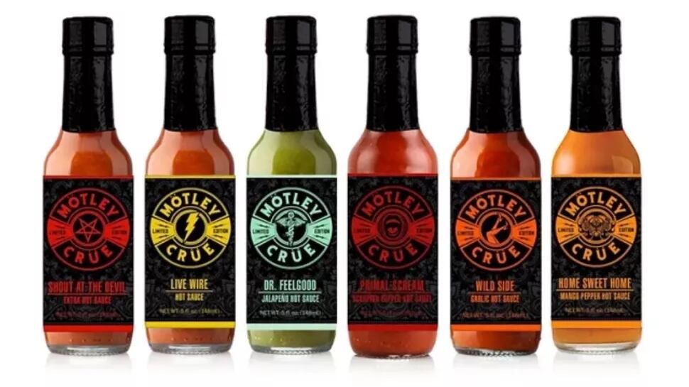 The Limited Edition ‘Motley Crue Hot Sauce Set’ features six hot sauces of different heat levels.