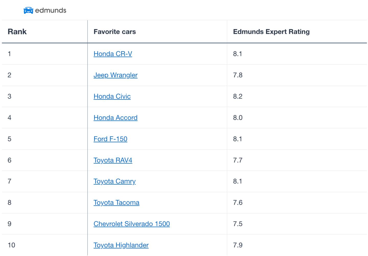 From compact crossovers in California to full-size trucks in Texas, Edmunds shoppers have a wide variety of favorite vehicles. Edmunds users' preferences were analyzed to determine the 10 most favorited makes and models of 2024, also looking at favorite model years and regions where shoppers were based.