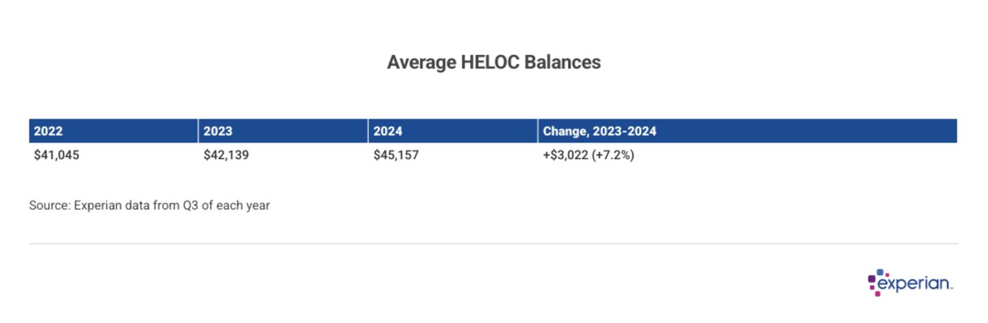 Overall, HELOC debt nationwide grew to $359.9 billion in 2024. This recent growth trend follows a decade of hibernation, during which time the average HELOC balance stayed roughly stable. In 2024, the average HELOC balance increased from $42,139 to $45,157, making the largest jump in recent years.