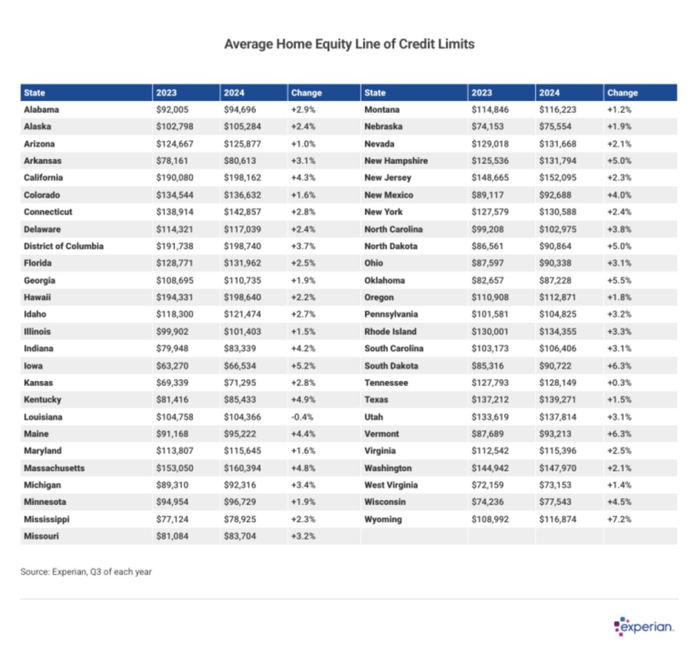 A combination of underlying equity and generally higher-than-average home prices explain the relatively larger HELOC credit limits in California and Massachusetts. Limits—as well as balances—are more modest in the Midwest. Only one state, Louisiana, saw the average fall slightly in 2024.