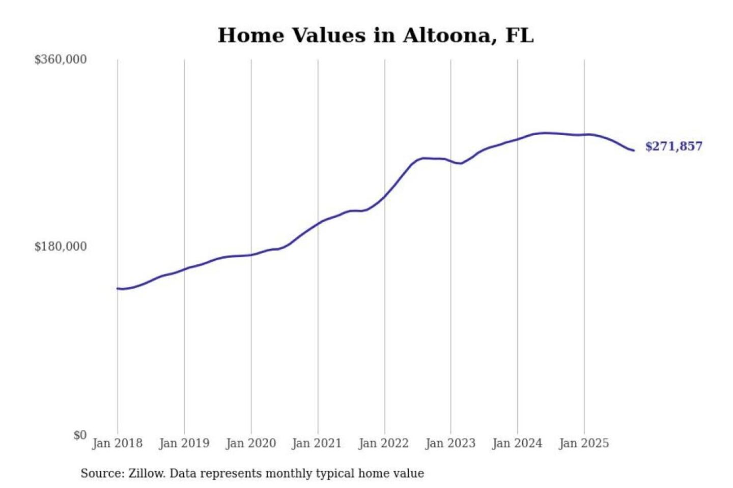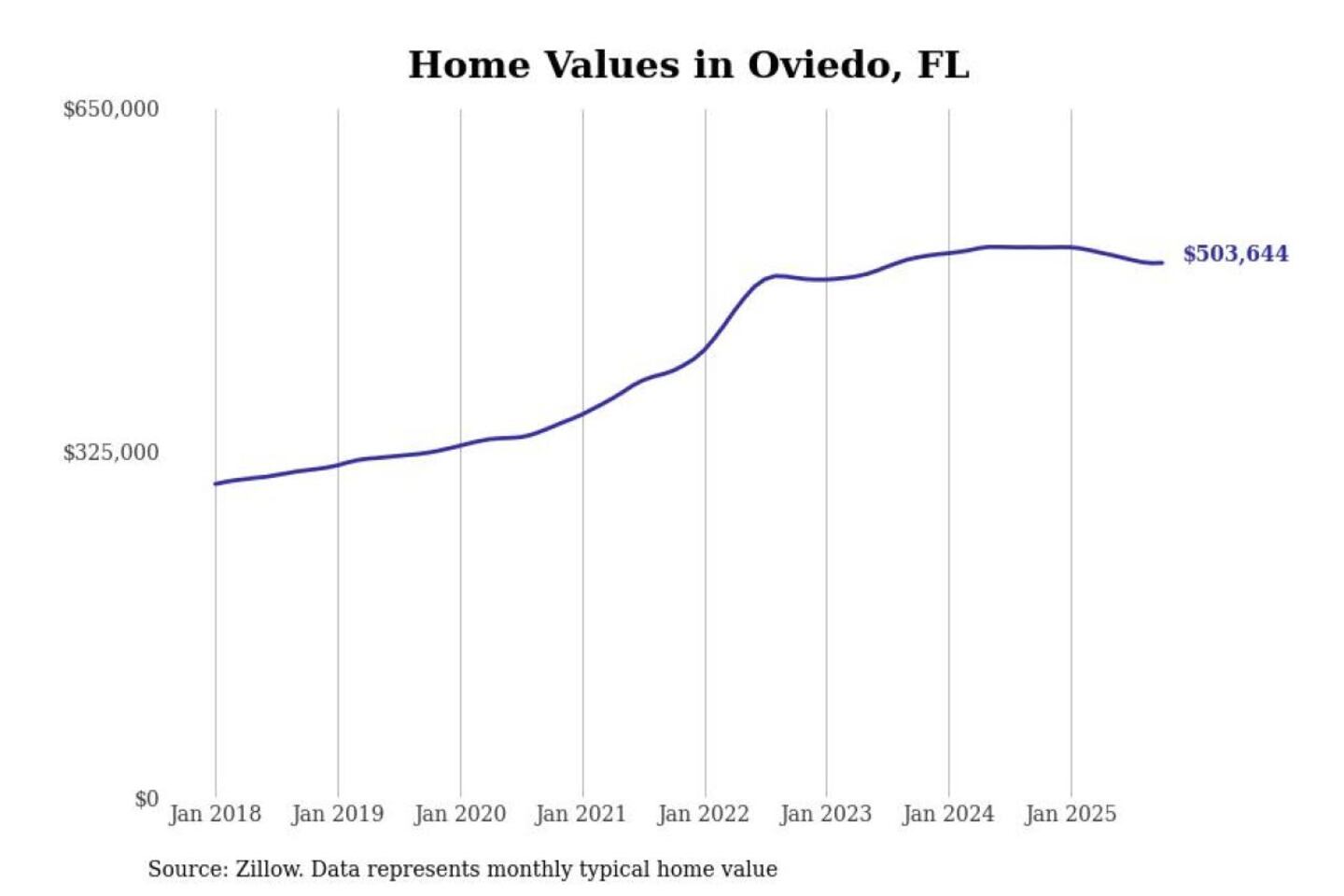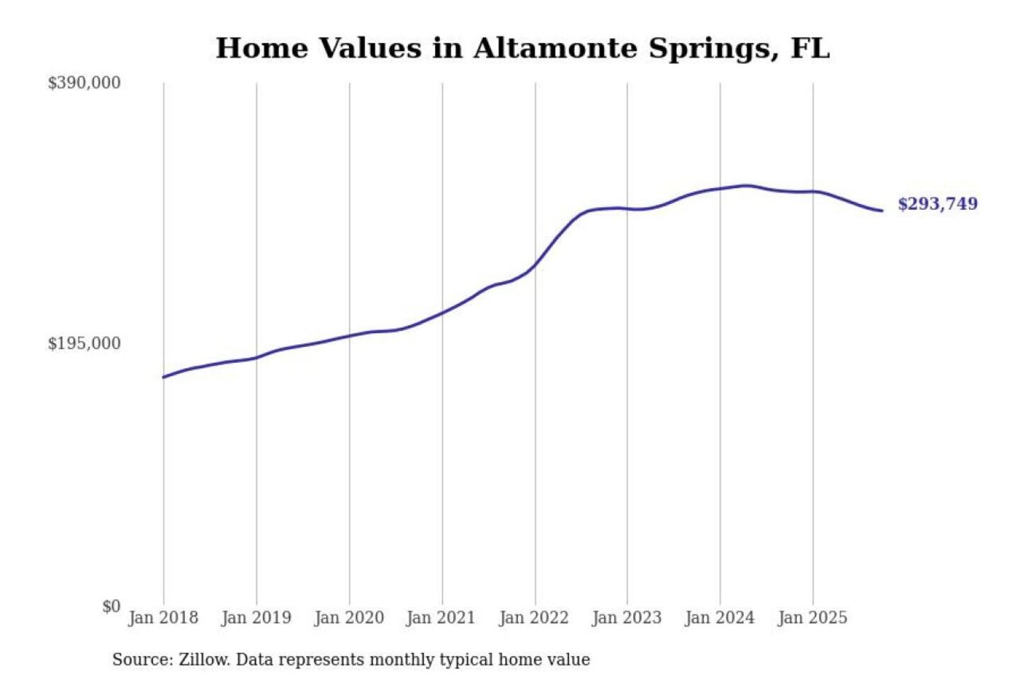 Stacker compiled a list of cities with the most expensive homes in the Orlando-Kissimmee-Sanford, FL metro area using data from Zillow. Charts show the monthly typical home value since January 2018.