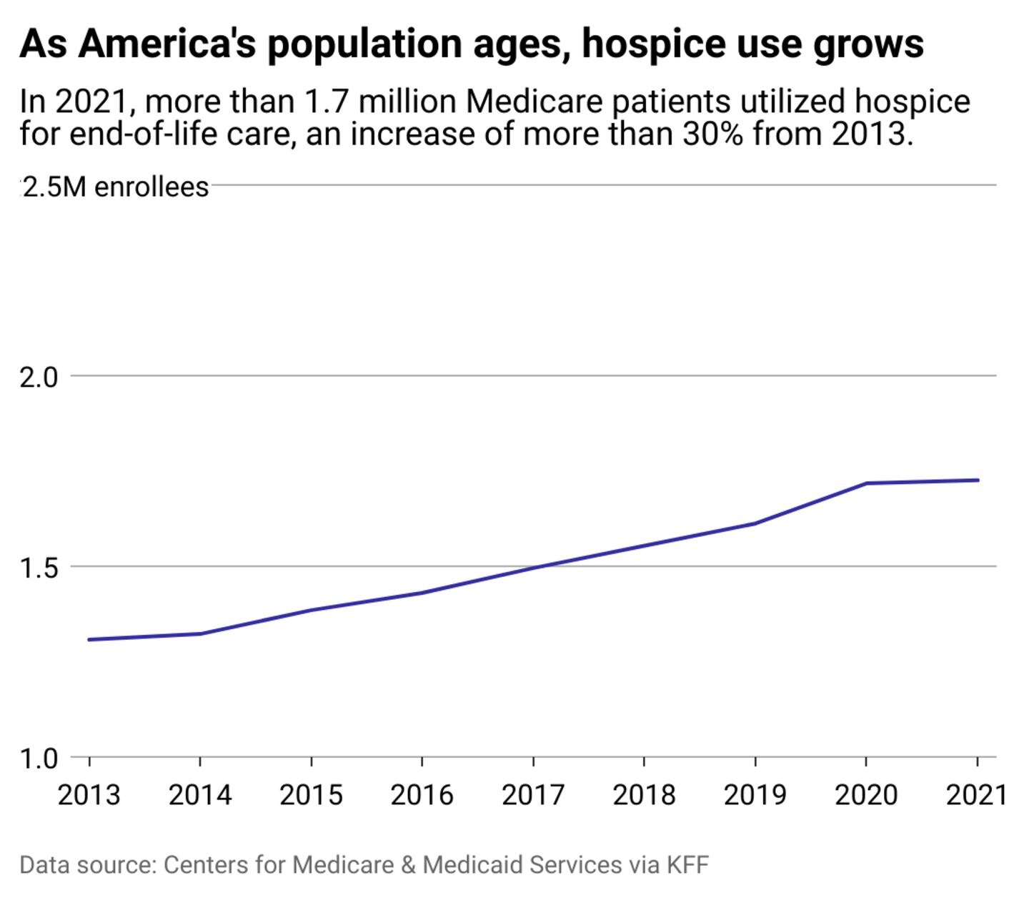 While EOLDs are still not mainstream, hospice care has evolved in the past two decades. The number of Medicaid beneficiaries who used hospice services rose by 30% between 2013 and 2021, according to KFF data. In 2021, 1.7 million Americans accessed hospice care from a pool of 2.6 million beneficiaries who died that year, meaning nearly 66% of patients chose to use hospice services.