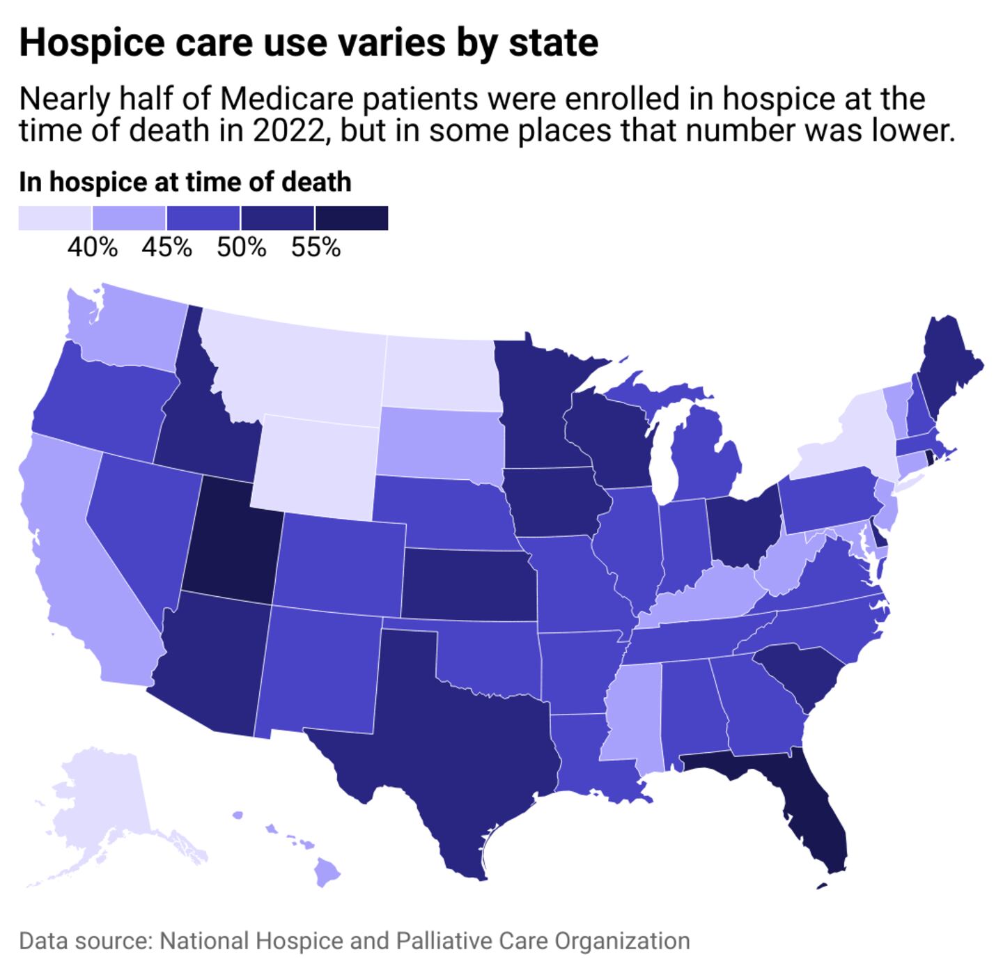 In 2022, nearly half of Medicare patients were enrolled in hospice at the time of their death, though figures vary from state to state. The increase in the use of hospice care services by older adults is a nationwide phenomenon, though usage varies widely.