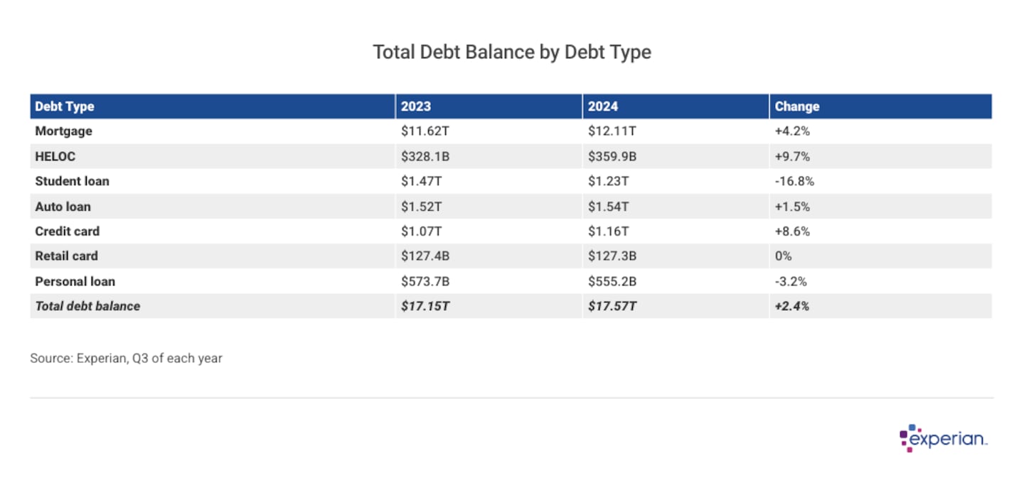 While the total consumer debt balance increased to $17.57 trillion in 2024, up 2.4% from 2023's $17.15 trillion, growth was slower than the 4.4% increase from 2022 to 2023.