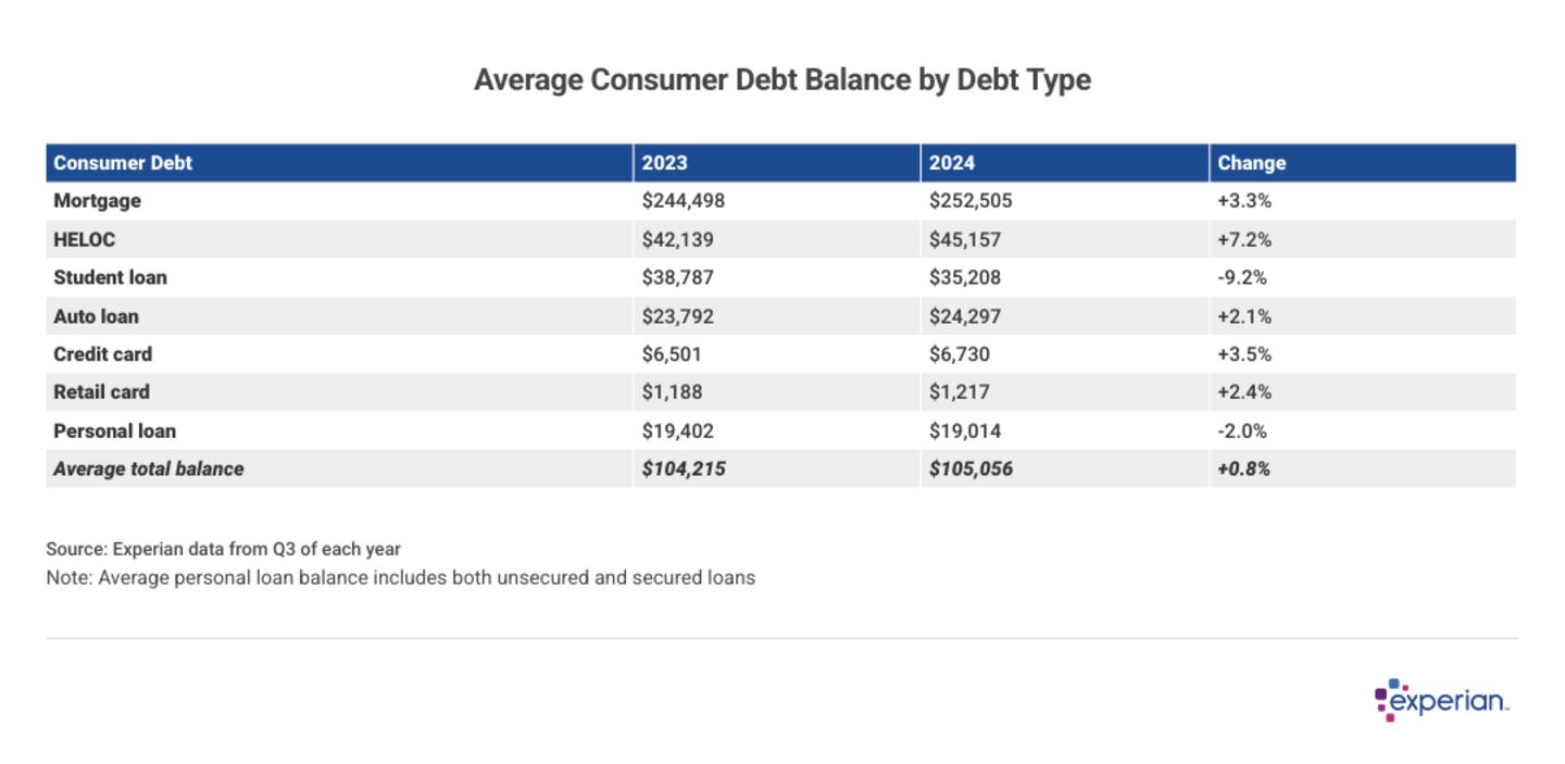 Average total debt balances among U.S. consumers were largely unchanged in 2024, as consumers, on average, saw their average debt loads remain roughly the same as a year ago.