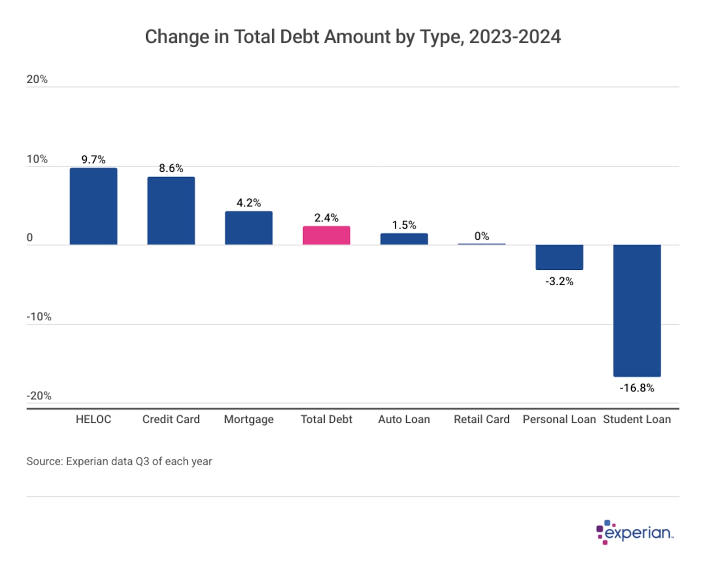 Home equity lines of credit (HELOCs) may be part of the reason for the decline in personal loan debt. HELOC balances grew by 9.7% from 2023 to 2024, as home equity among homeowners, both with and without other debts or renovations to finance, finally began to tap some of the collective $30 trillion in real estate value they own.