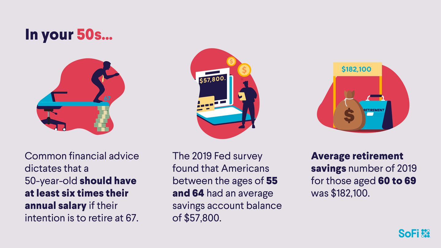The average retirement savings account for a person between the ages of 50 and 59 is $160,000. It's important to note that taking a withdrawal from such a plan before the age of 59 ½ could mean tax penalties.