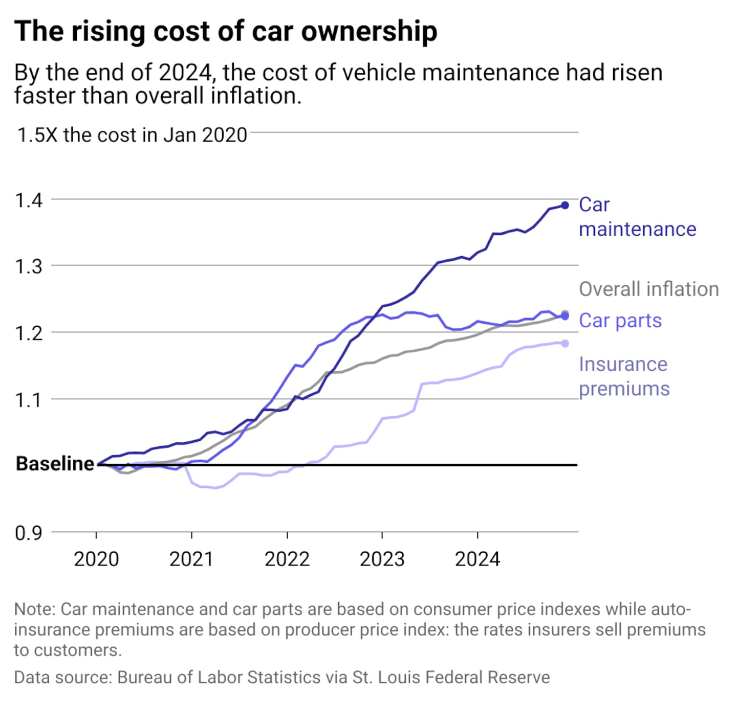 BLS data shows that although maintenance and repair costs have climbed steadily since the 1960s, they've skyrocketed over the last few years. This is the "main reason" for higher insurance rates, The New York Times reported.