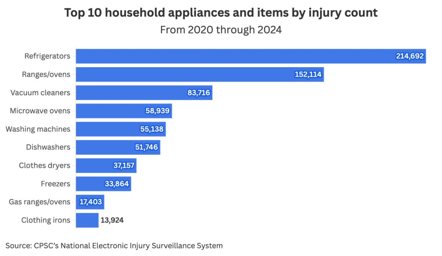 From 2020 through 2024, home refrigerators caused the most harm, with over 214,000 injuries reported. Ranges and ovens were next, with more than 152,000 injuries, and vacuum cleaners ranked third, with almost 84,000 injuries over the same time period.