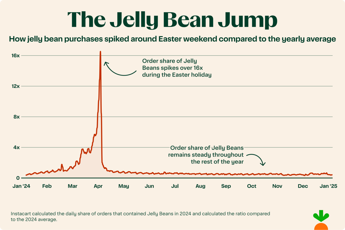 Jelly beans have their moment to shine in the spring, with a 16.6x higher order share the day before Easter versus the yearly average according to Instacart data. Our survey findings back this up with more than a third (35%) of Americans saying jelly beans are among the Easter candies they enjoy most.