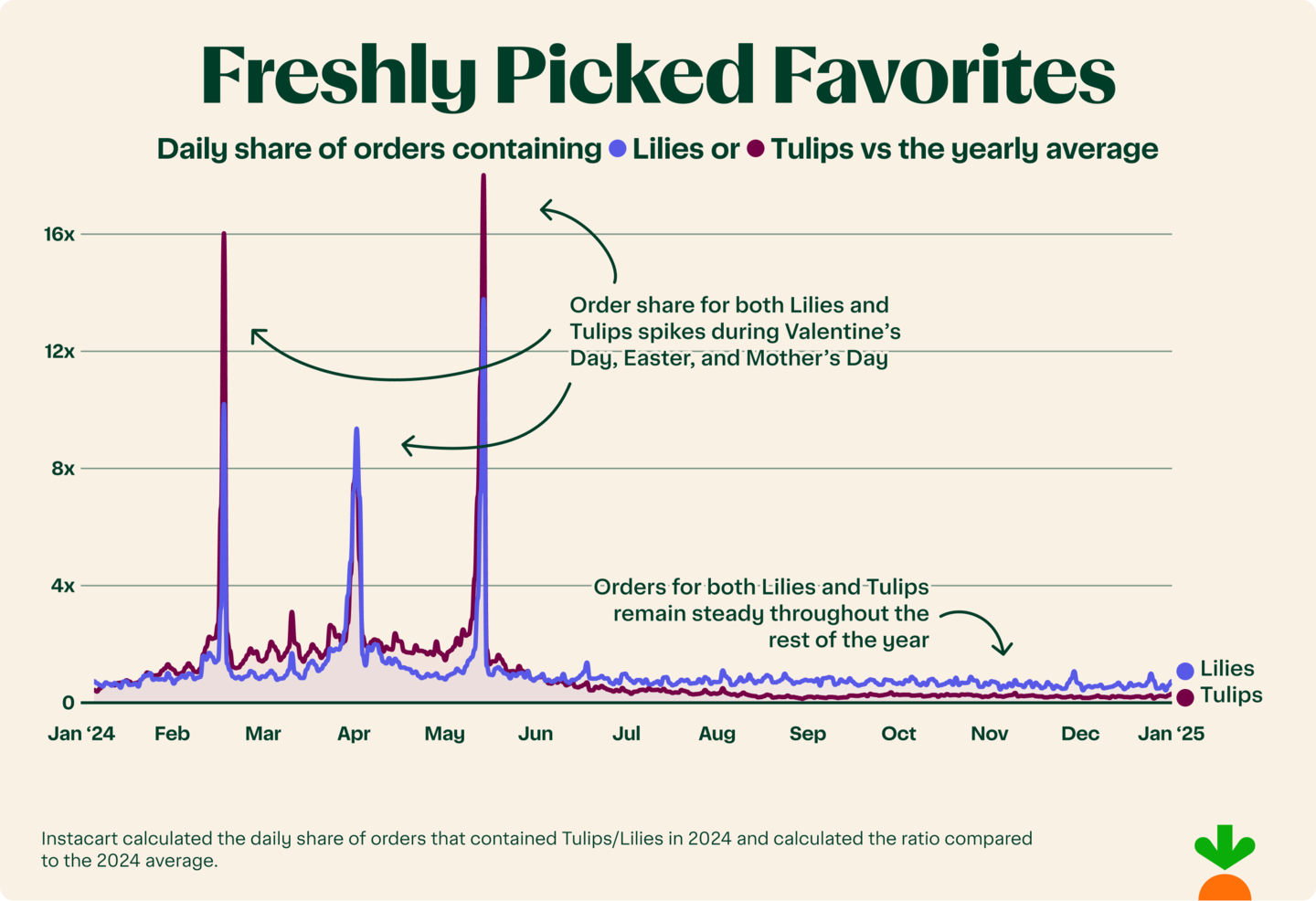 Customers were 8.6x more likely to put fresh tulips in their cart the day before Easter in 2024 than they were compared to the rest of the year.