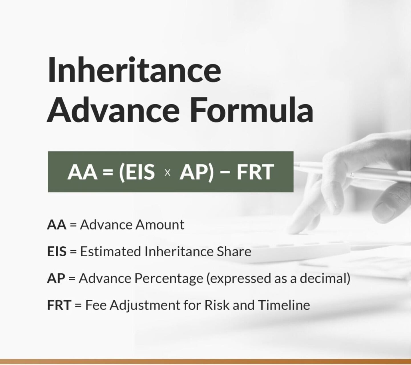 The fee is expressed as a percentage of the inheritance. Inheritance advance companies do not use a publicly shared, fixed formula like how banks use a loan calculator, but you can follow this basic formula: