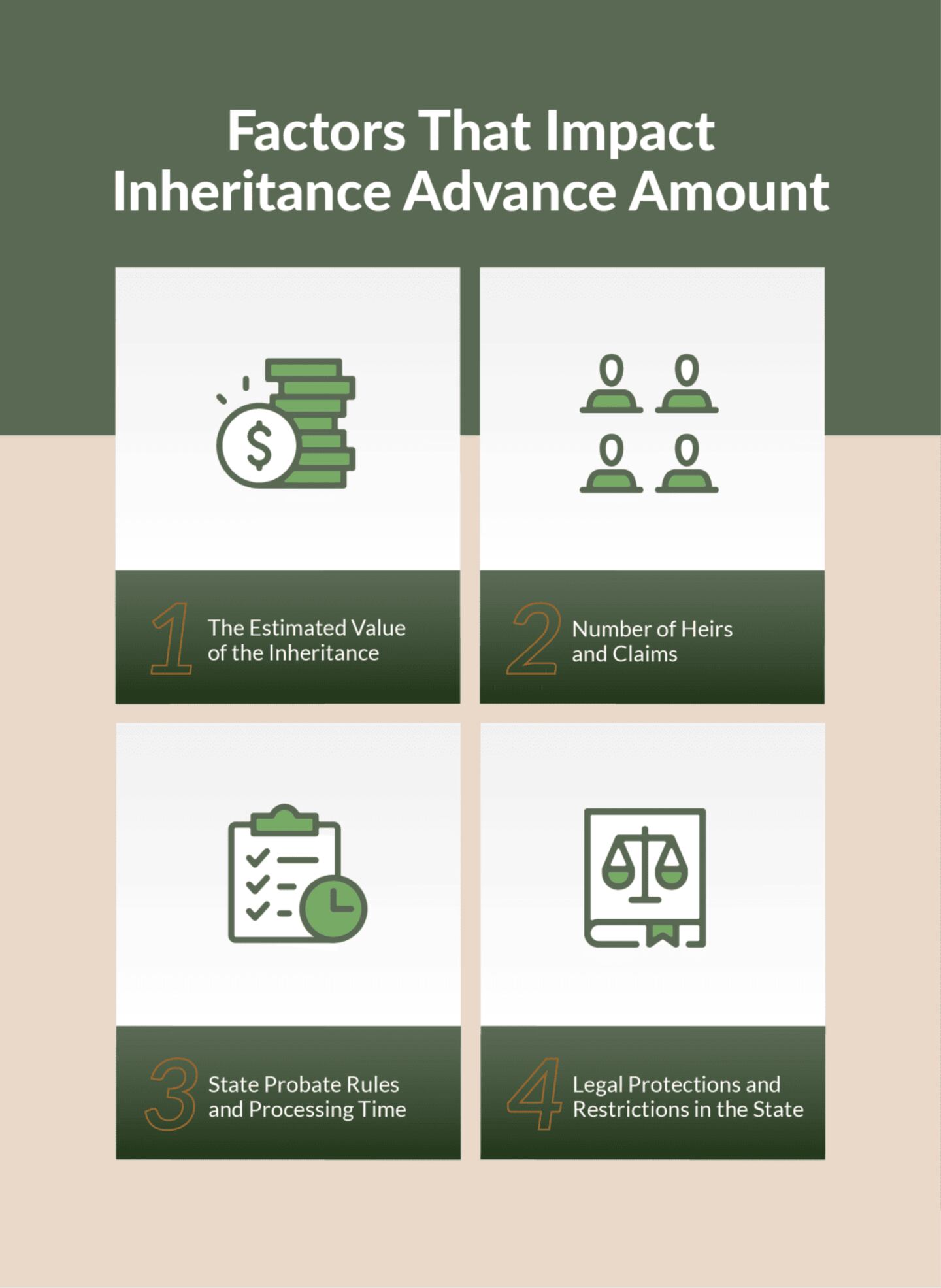 The amount of an inheritance advance depends on several key factors that help the company decide how much risk they are willing to take and how soon they are likely to be repaid. Inheritance advance companies offer a percentage of the estimated inheritance value, depending on: