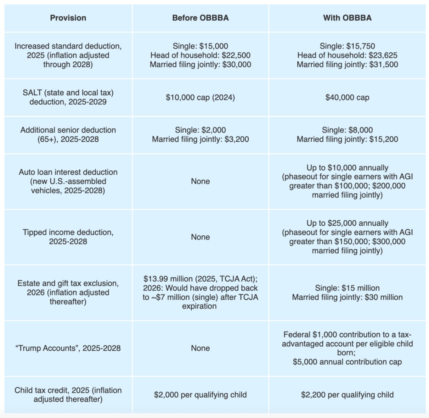 Provisions of the One Big Beautiful Bill Act (OBBBA) offer Americans additional tax deductions and credits that will take effect for tax year 2025, with many lasting through 2028 and beyond. Many people should expect some tax savings, as the provisions incentivize a wide net of statuses and activities, including young families, seniors, tipped workers, new car purchases, and gifting and inheritance. OBBBA is also structured to provide tax relief regardless of whether you choose the standard or itemized deduction, or whether you file as single, married or head of household.
