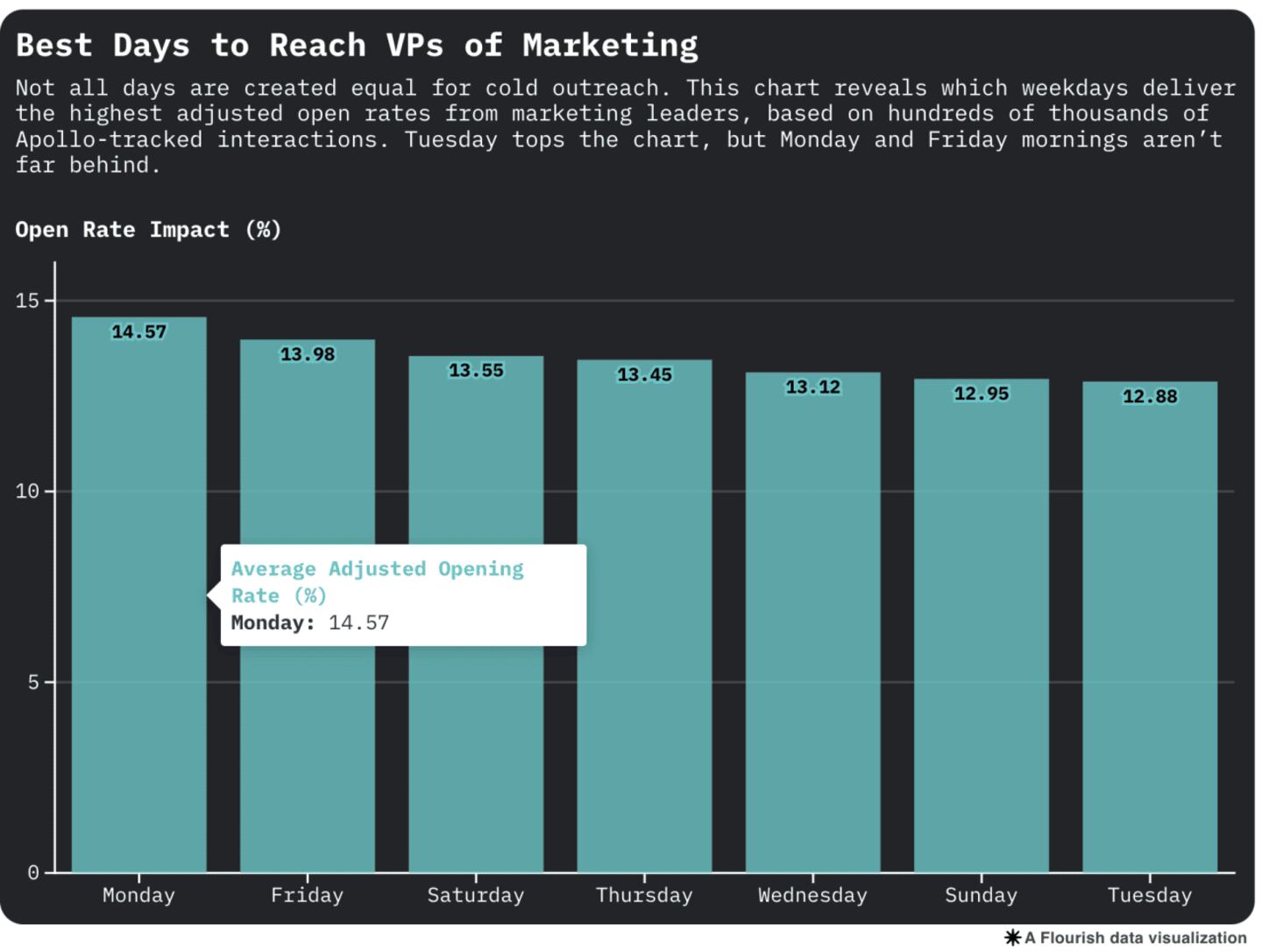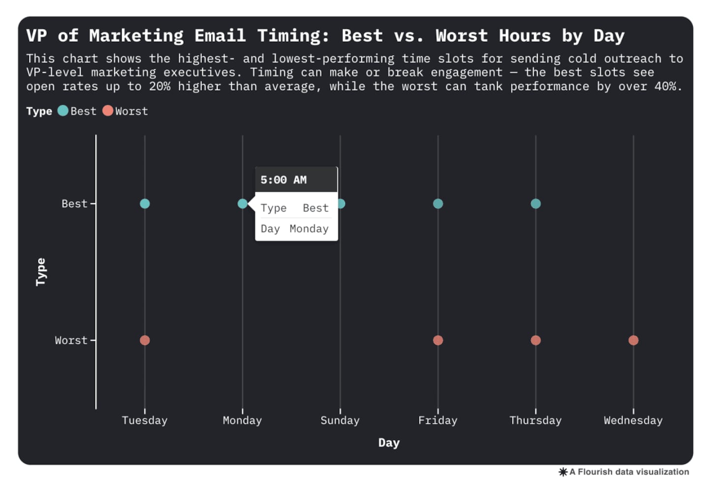 Actionable Takeaway: If you're pitching a vice president of marketing, schedule for Tuesday at 1 a.m. or Monday at 6 a.m. And avoid Friday afternoons, where open rates can drop by as much as 42%.