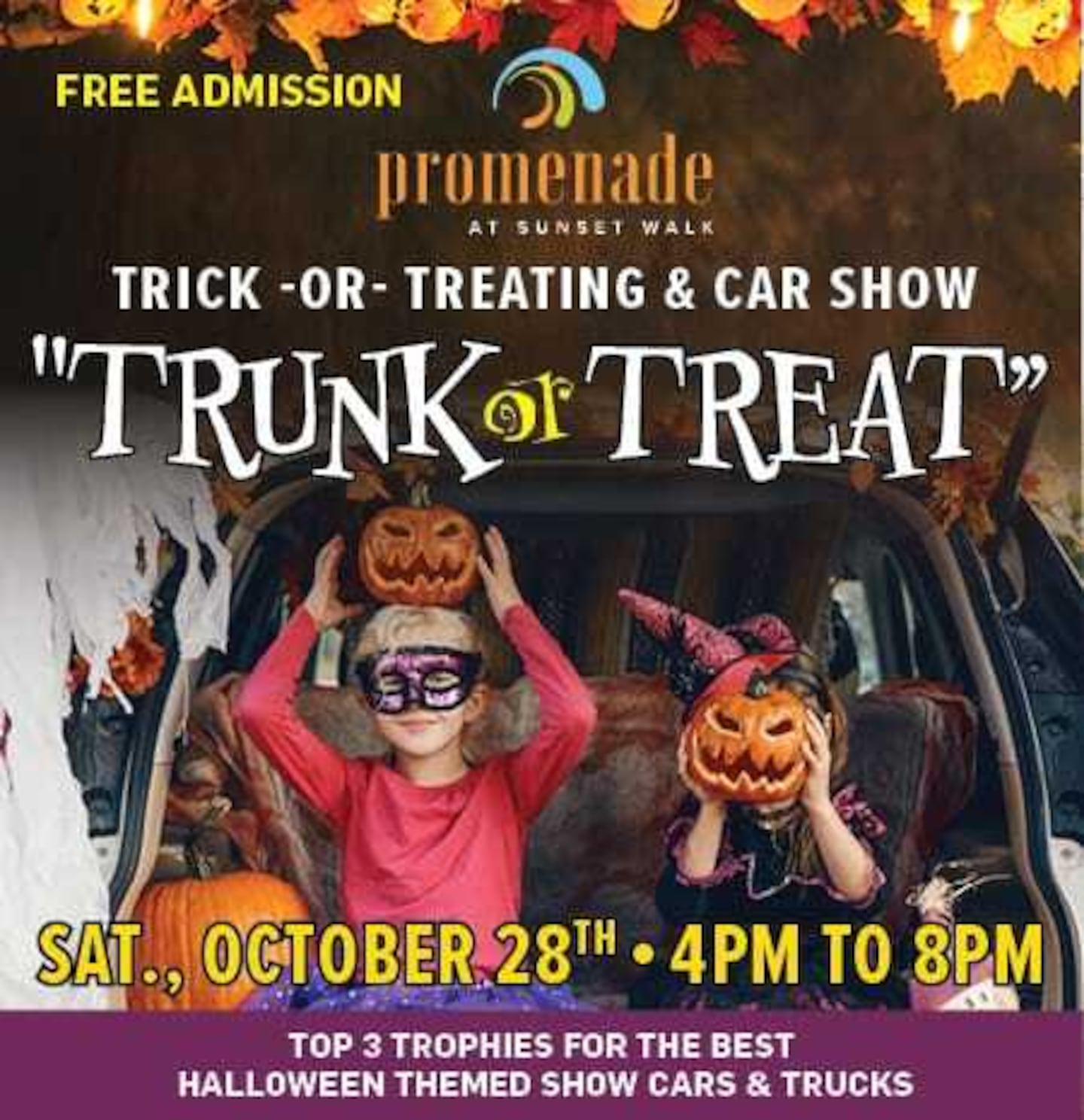 The 4th annual Trunk or Treat Car Show will take place at the Promenade at Sunset Walk in Kissimmee this Saturday, October 28th from 4-8 p.m.