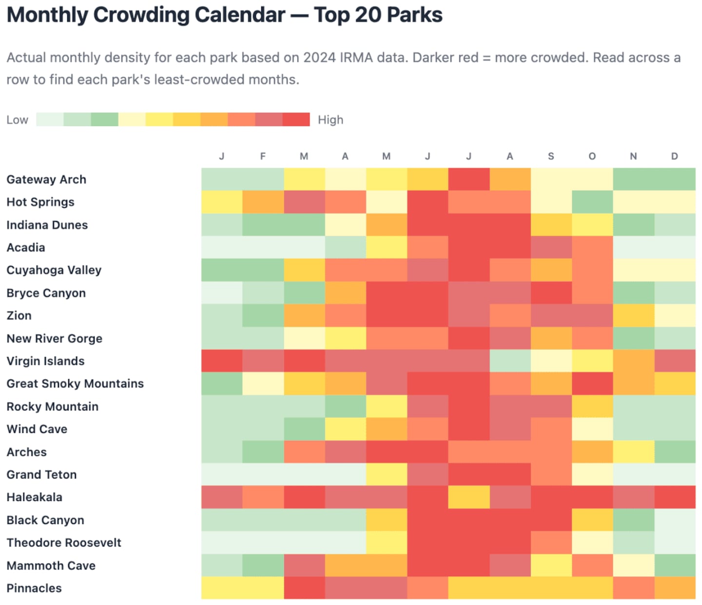 Outwander.com built an overcrowding index for all 63 national parks to answer the only question that matters for trip planning: When should you actually go?