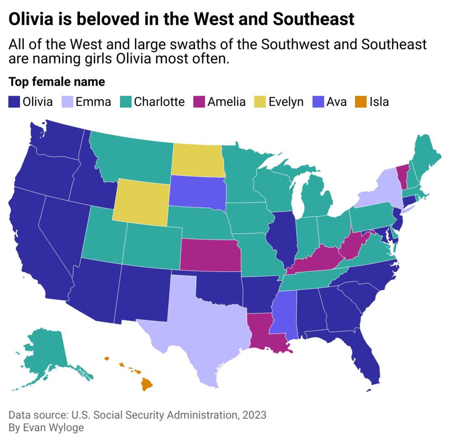 Olivia is the most popular name in the country, and that's been the case for years. But a closer look at regional variation tells a more nuanced story.