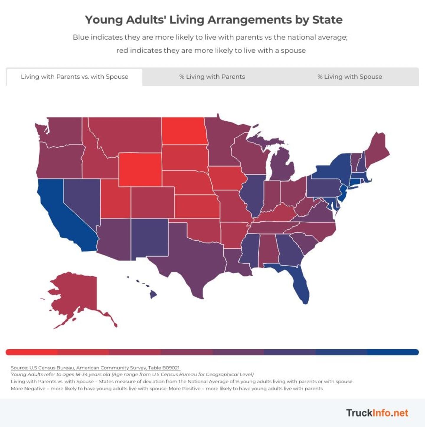 To better understand why and where adult children live with their parents, researchers at TruckInfo.net analyzed data from the U.S. Census Bureau, the Bureau of Labor Statistics, and the Federal Reserve. They found the following trends.