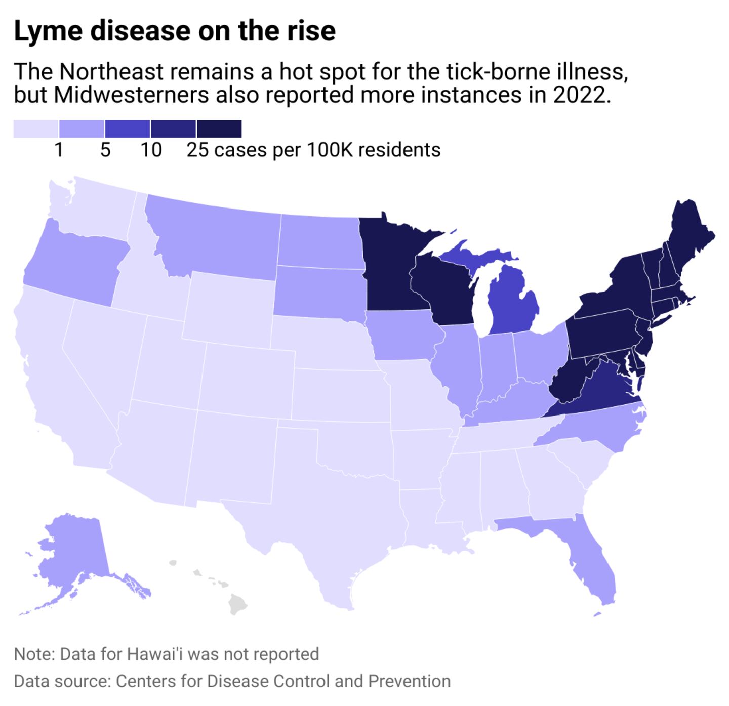 The number of reported cases of Lyme disease has increased fivefold from the 1990s; from 3.74 reported cases per 100,000 people to 18.9 in 2022. Adults over age 65 have been particularly impacted.