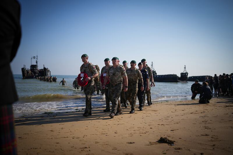 D-Day 80th Anniversary ASNELLES, FRANCE - JUNE 06: Royal Marines of 47 Commando land on Gold Beach to mark the 80th anniversary of the D-Day landing on June 06, 2024 in Asnelles, France. June 6th is the 80th anniversary of the D-Day landings which saw 156,000 troops from the allied countries including the United Kingdom and the United States join forces to launch an audacious attack on the beaches of Normandy, these assaults are credited with the eventual defeat of Nazi Germany. (Photo by Christopher Furlong/Getty Images) (Christopher Furlong/Getty Images)
