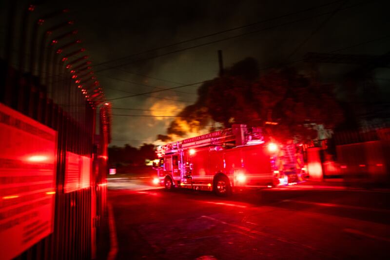 Chevron oil refinery fire EL SEGUNDO, CALIFORNIA - OCTOBER 3: Fire fighters arrive to fight a fire that burns at a Chevron refinery on October 3, 2025 in El Segundo, California. A big explosion around 10pm (PST) on October 02, producing a large orange blaze that could be seen from miles away from the refinery close by the Los Angeles airport. (Photo by Apu Gomes/Getty Images) (Apu Gomes/Getty Images)
