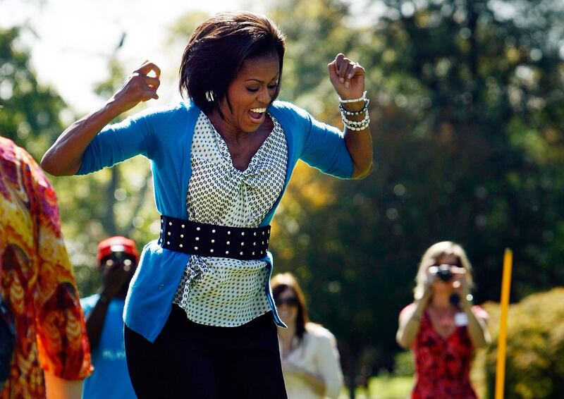 U.S. first lady Michelle Obama reacts as she jump ropes "Double Dutch" on the South Lawn of the White House during an event promoting exercise and healthy eating for children October 21, 2009 in Washington, DC.