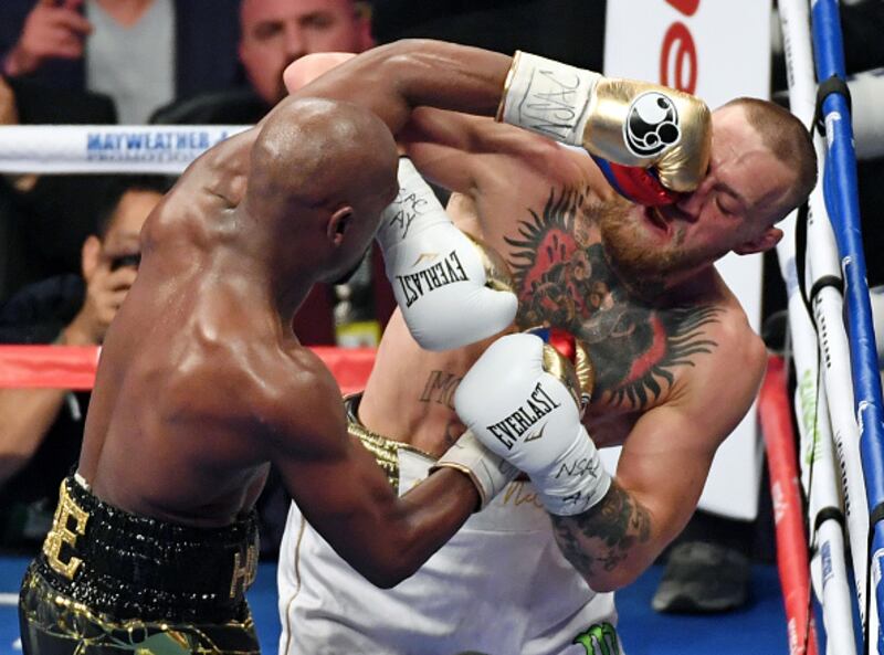 Lights out: Conor McGregor lands a second punch on the Miami Heat's mascot during a skit Friday night during Game 4 of the NBA Finals. (Joe Murphy/NBAE via Getty Images)