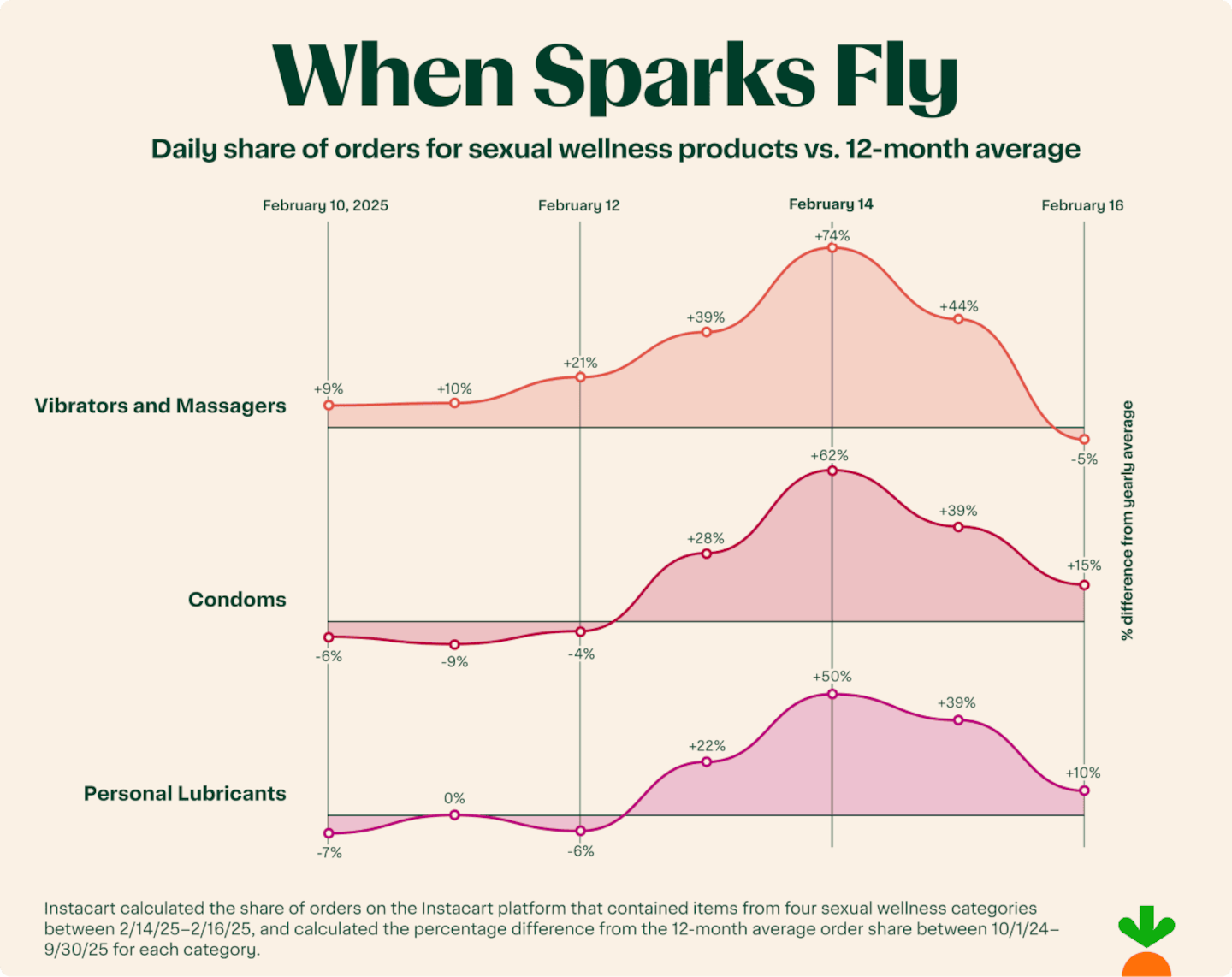 • Valentine's Day sparks more than flowers and candy. Orders for sexual wellness essentials peaked sharply on February 14, including Vibrators and Massagers (+74%), Condoms (+62%), and Personal Lubricants (+50%), underscoring the holiday's uniquely concentrated, occasion-driven shopping behavior.