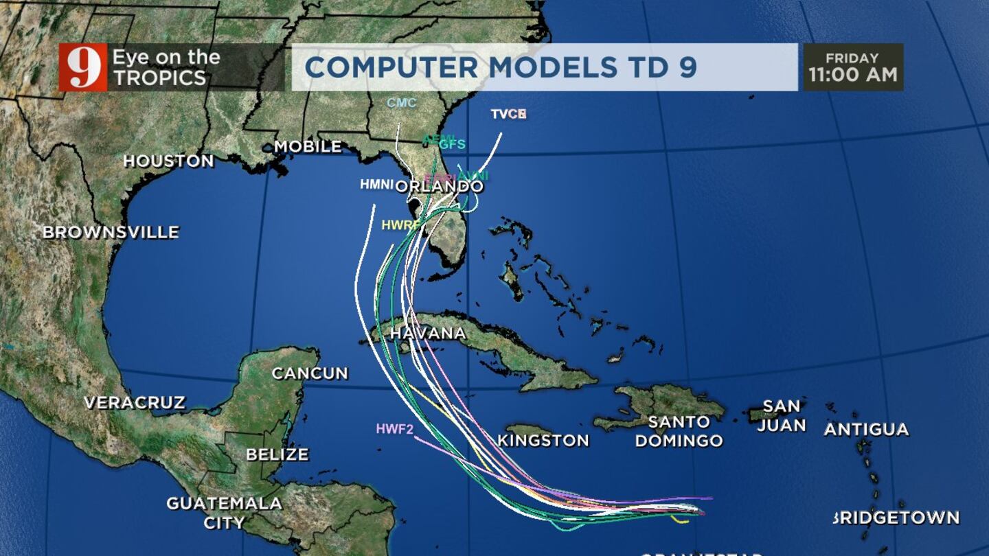 The latest computer models on the track of Tropical Depression 9 shows it clustered over western Cuba and then heading toward southwest Florida.